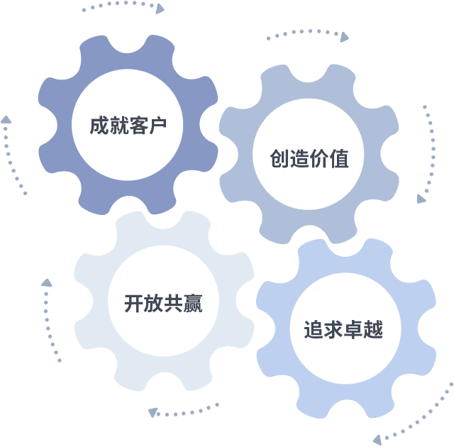 成就客户是一切决策的出发点,,创造价值是衡量所有工作的标准,,追求卓越是我们做事做人的态度,,,开放共赢是我们的格局也是最终的结果。。。价值观的齿轮环环相扣,,推动着组织里的每个人不断向前。。